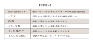 内部強化に着目し、低分子活性型ケラチンと、新成分のジマレイン酸を配合しています。